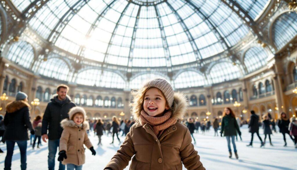 Glisser sous cette voûte historique crée un contraste saisissant entre la modernité de l’activité et la majesté du lieu. Le silence des patins sur la glace résonne dans le volume monumental de la Nef, tandis que les regards se lèvent instinctivement vers la cime de la verrière. C’est un moment où le sport, le loisir et la culture se rencontrent. On ne fait pas que patiner, on vit une expérience esthétique, on s’imprègne de l’histoire d’un des monuments les plus emblématiques de Paris.